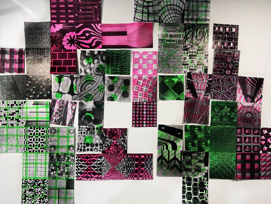 When prompted to create a collection of found things in London, patterns were a natural attraction for me. I’ve always been drawing patterns and appreciating them everywhere I go, and this project was an opportunity to do an intensive search for patterns anywhere I could find them. I collected patterns on every material I could think of from fabric, to stone, to building structures that contained repeating elements and shapes. After collecting these, I desaturated all images to be able to sort the patterns by shape and form. From these groups, I formed tetris-like shapes to be able to create an abstract and organic pattern, of patterns, printed on a large piece of canvas fabric.